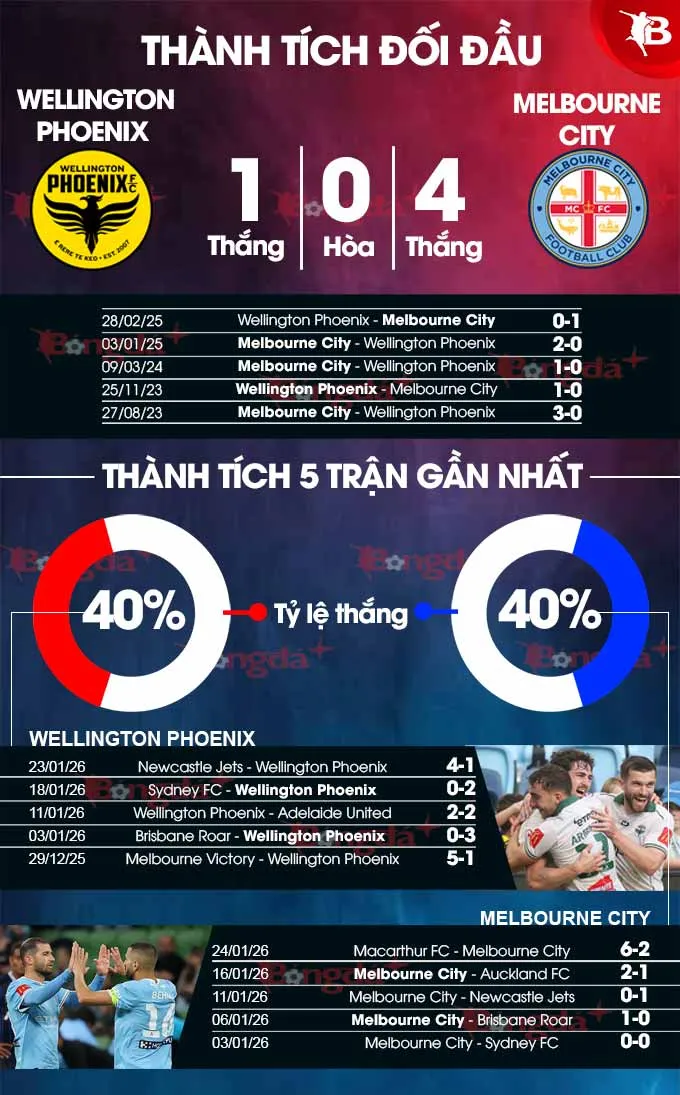 Mặc dù phong độ hiện tại khá cân bằng, nhưng lợi thế lịch sử đối đầu nghiêng hẳn về phía Melbourne City. Với chuỗi thành tích ấn tượng khi làm khách trước Wellington Phoenix, City được kỳ vọng sẽ giành trọn 3 điểm trong một trận cầu có nhiều bàn thắng.