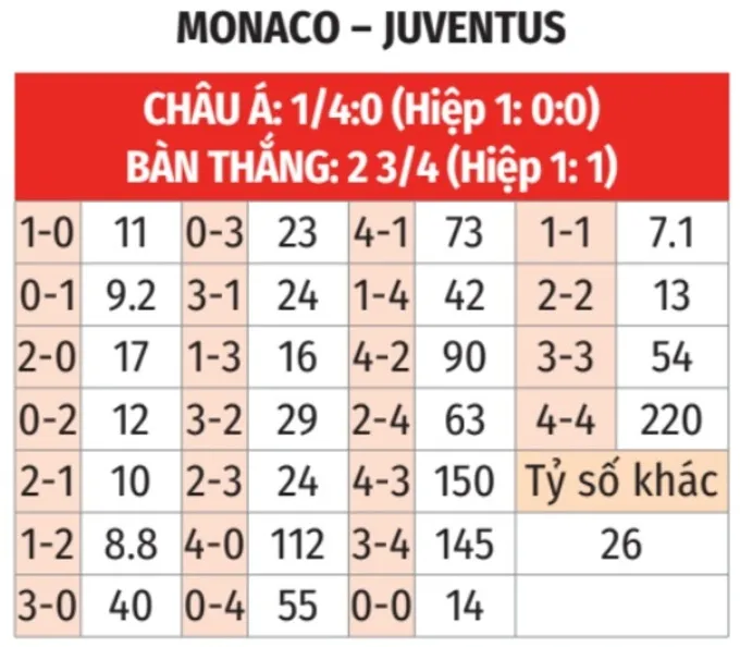 - Hiệp 1 ít bàn: 4/5 lần gặp nhau gần đây chỉ có tối đa 1 bàn trong hiệp 1. Xu hướng này cũng xuất hiện ở 3/4 trận gần nhất của Monaco và 11/12 trận của Juventus.