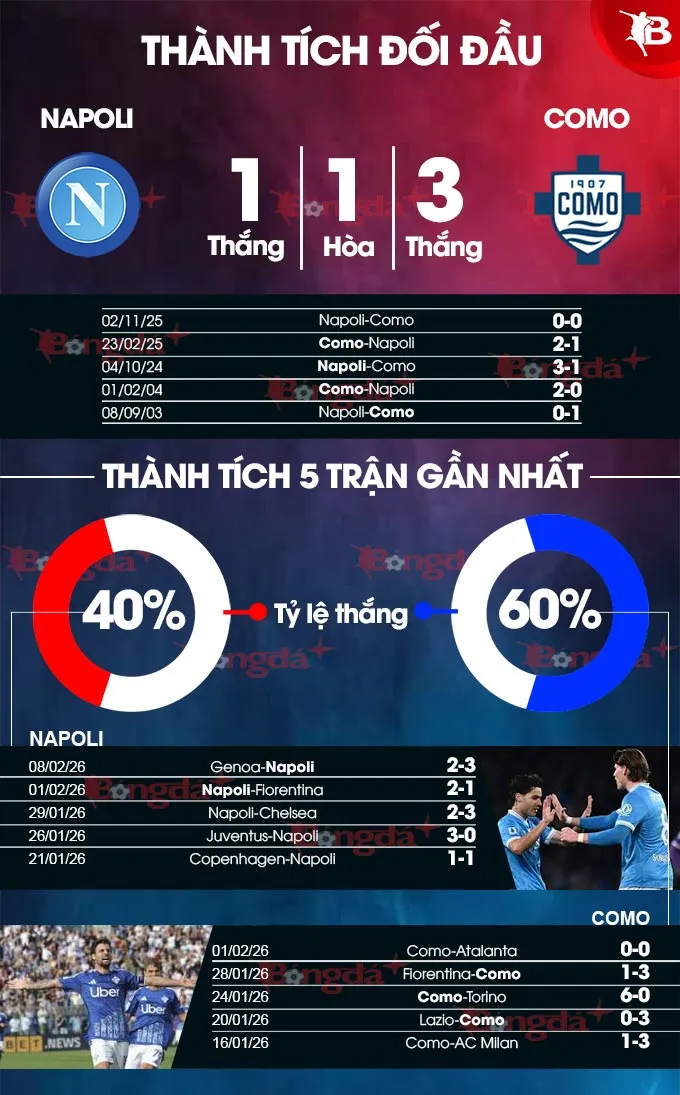 Đối thủ lần này, Como, là một thách thức lớn hơn nhiều khi đang xếp thứ 6 Serie A. Phong độ của đội khách rất ấn tượng với 3 chiến thắng trong 4 trận gần nhất. Đặc biệt, họ từng cầm hòa Napoli 0-0 ngay trên sân khách ở lượt đi Serie A hồi tháng 11. Với lối chơi bài bản dưới thời HLV Fabregas, Como hoàn toàn có thể tái diễn kịch bản tương tự.