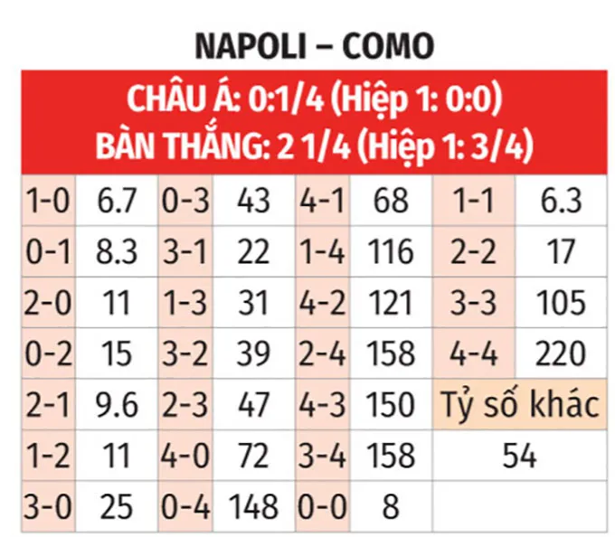 - Tỷ số chẵn: 3/4 lần chạm trán gần nhất giữa hai đội đều kết thúc với tỷ số chẵn. 5/6 trận gần đây của Como cũng có số bàn thắng chia hết cho 2.