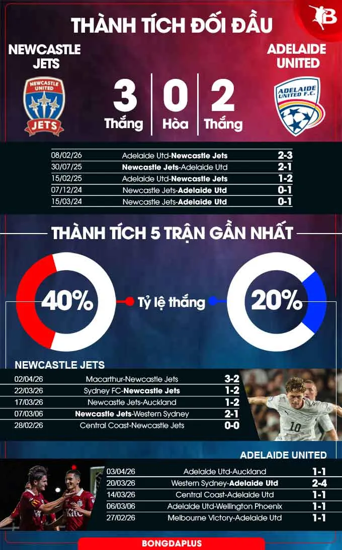 Phong độ đối đầu: Newcastle Jets thăng hoa, Adelaide Utd bất bại sân khách