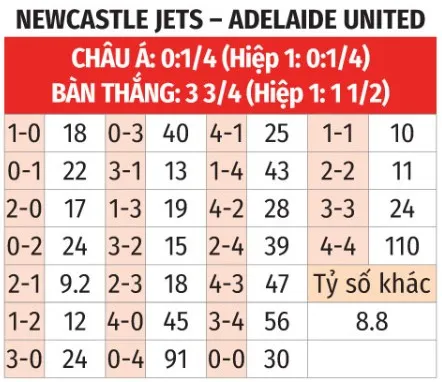 - Lợi thế chủ nhà: Newcastle Jets đã thắng cả 3 trận sân nhà gần đây khi chấp đối thủ từ 1/4 đến 3/4 bàn. Ngược lại, Adelaide Utd để thua trong 4/6 trận làm khách gần nhất ở cùng tỷ lệ chấp. Lịch sử đối đầu cũng nghiêng về Newcastle Jets với 3 chiến thắng liên tiếp.